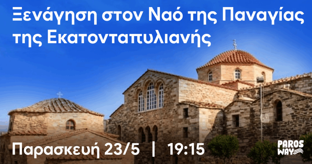 Την Παρασκευή 23 Μαΐου και ώρα 19:15 έχει προγραμματιστεί μια μοναδική ξενάγηση στον Ναό της Παναγίας της Εκατονταπυλιανής στην Παροικιά.