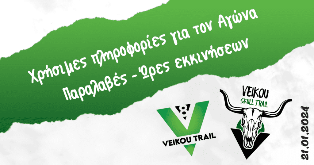 Η Οργανωτική Επιτροπή του 8ου Veikou Trail ενημερώνει τους συμμετέχοντες δρομείς, ότι η παραλαβή των πακέτων συμμετοχής, όπως είναι γνωστό και από την προκήρυξη της διοργάνωσης, θα πραγματοποιηθεί μόνο το προσεχές Σάββατο 20/01 (μία ημέρα πριν την διοργάνωση), από το σημείο που έχουν επιλέξει κατά την εγγραφή τους. Οι ώρες παραλαβής αναφέρονται παρακάτω :Κεντρική είσοδος Άλσος Βεΐκου| Λεωφ. Βεΐκου, Γαλάτσι – 10:00 – 17:00