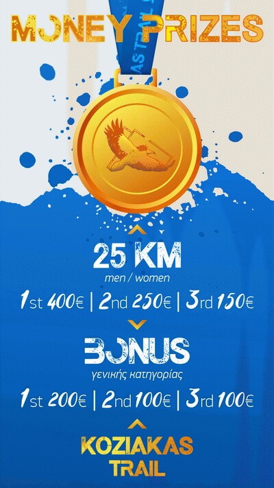 Στον αγώνα 25χλμ. του 2ου Koziakas Trail οι τρεις πρώτοι άνδρες και οι τρεις πρώτες γυναίκες θα λάβουν χρηματικά έπαθλα. Πιο συγκεκριμένα: